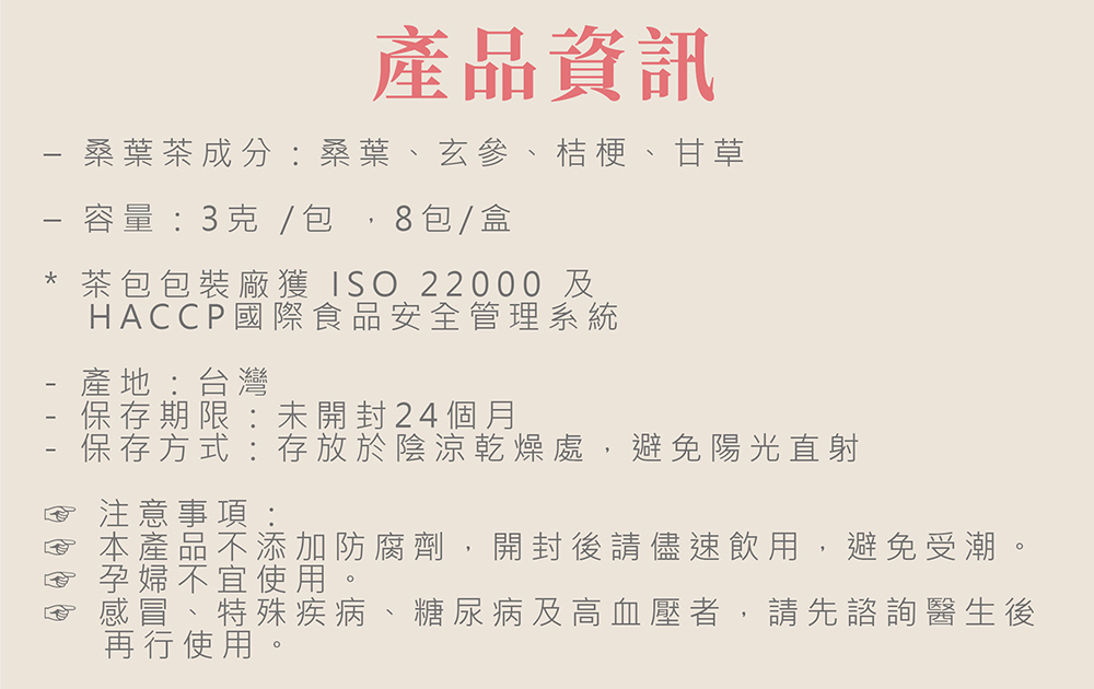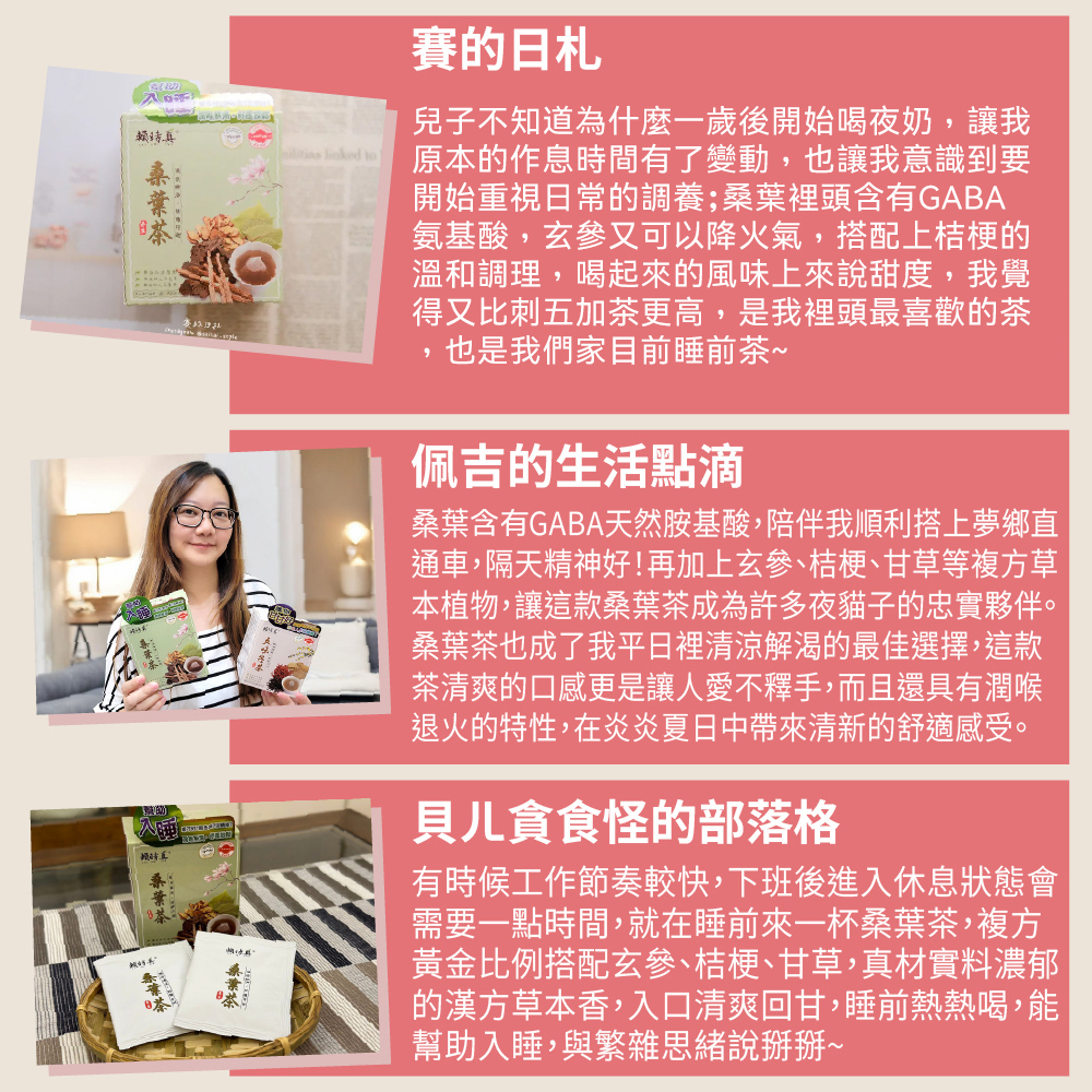 一身是寶的桑葉又稱「神仙葉」含有GABA天然胺基酸,添加玄參、桔梗、甘草等複方草本植物,可幫助入睡、鬆暢自在且潤喉退火。